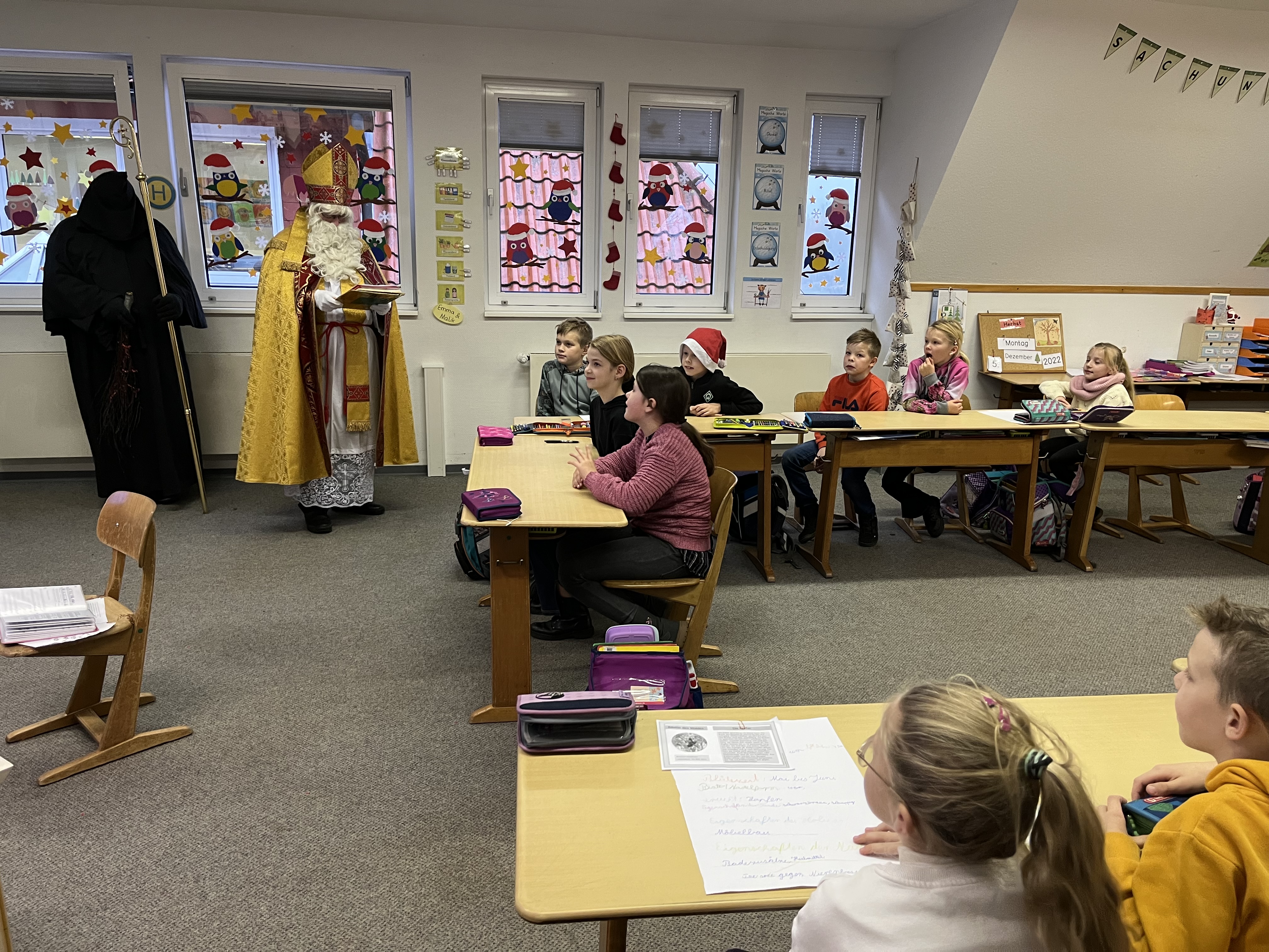 Heute durften wir hohen Besuch Willkommen heißen: Der Nikolaus hat sich auf den weiten Weg nach Löningen gemacht und uns in unserem momentanen Domizil im Dachgeschoss der Gelbrinkschule besucht. Gemeinsam mit seinem Knecht Ruprecht nahm er sich viel Zeit, um in jeder Klasse aus seinem goldenen Buch vorzulesen. Die Kinder hatten sich ganz toll vorbereitet und empfingen ihn mit Liedern und Gedichten. Dafür wurden sie vom Nikolaus mit liebevoll gepackten Tüten belohnt, die unser Förderverein organisiert hat.