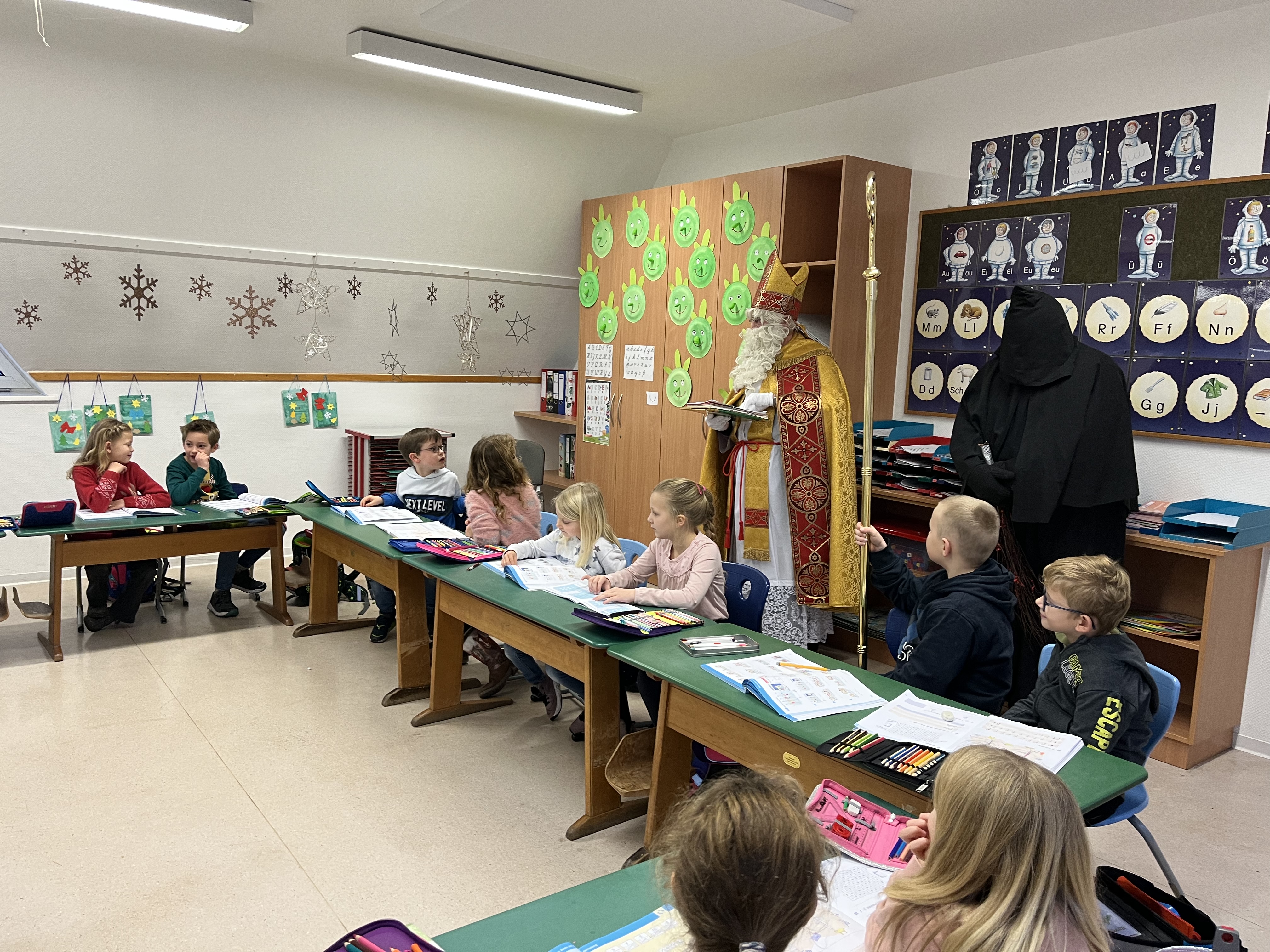 Heute durften wir hohen Besuch Willkommen heißen: Der Nikolaus hat sich auf den weiten Weg nach Löningen gemacht und uns in unserem momentanen Domizil im Dachgeschoss der Gelbrinkschule besucht. Gemeinsam mit seinem Knecht Ruprecht nahm er sich viel Zeit, um in jeder Klasse aus seinem goldenen Buch vorzulesen. Die Kinder hatten sich ganz toll vorbereitet und empfingen ihn mit Liedern und Gedichten. Dafür wurden sie vom Nikolaus mit liebevoll gepackten Tüten belohnt, die unser Förderverein organisiert hat.