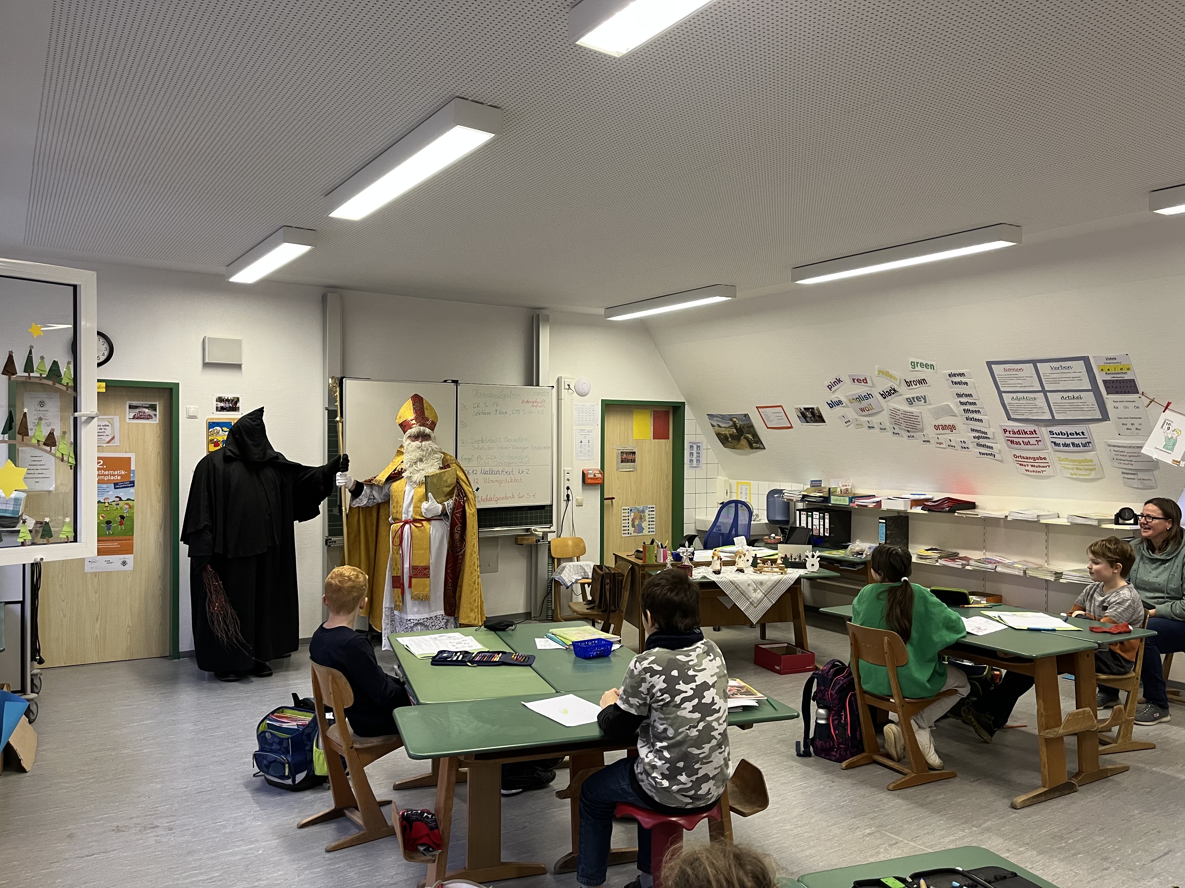 Heute durften wir hohen Besuch Willkommen heißen: Der Nikolaus hat sich auf den weiten Weg nach Löningen gemacht und uns in unserem momentanen Domizil im Dachgeschoss der Gelbrinkschule besucht. Gemeinsam mit seinem Knecht Ruprecht nahm er sich viel Zeit, um in jeder Klasse aus seinem goldenen Buch vorzulesen. Die Kinder hatten sich ganz toll vorbereitet und empfingen ihn mit Liedern und Gedichten. Dafür wurden sie vom Nikolaus mit liebevoll gepackten Tüten belohnt, die unser Förderverein organisiert hat.