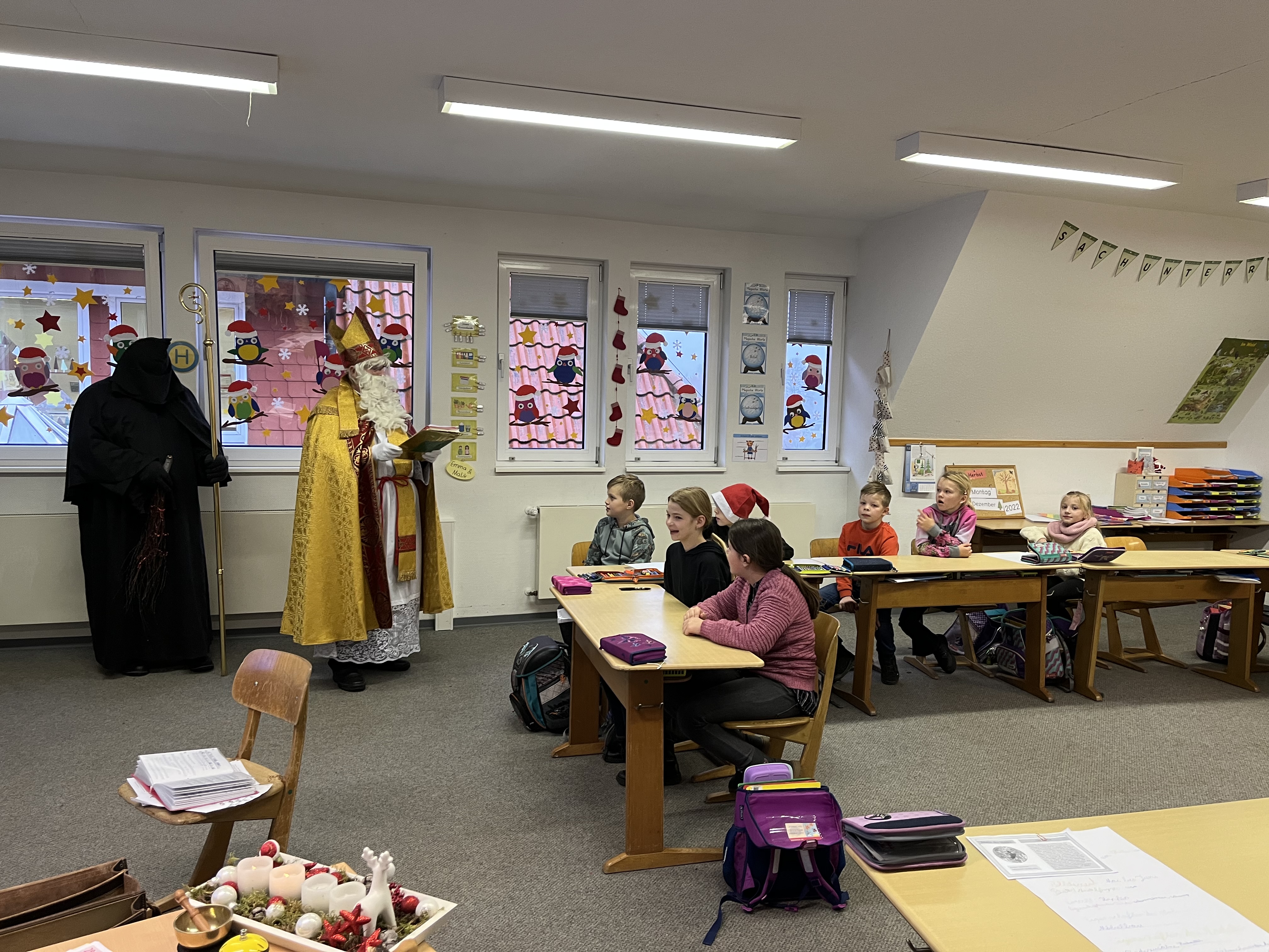 Heute durften wir hohen Besuch Willkommen heißen: Der Nikolaus hat sich auf den weiten Weg nach Löningen gemacht und uns in unserem momentanen Domizil im Dachgeschoss der Gelbrinkschule besucht. Gemeinsam mit seinem Knecht Ruprecht nahm er sich viel Zeit, um in jeder Klasse aus seinem goldenen Buch vorzulesen. Die Kinder hatten sich ganz toll vorbereitet und empfingen ihn mit Liedern und Gedichten. Dafür wurden sie vom Nikolaus mit liebevoll gepackten Tüten belohnt, die unser Förderverein organisiert hat.