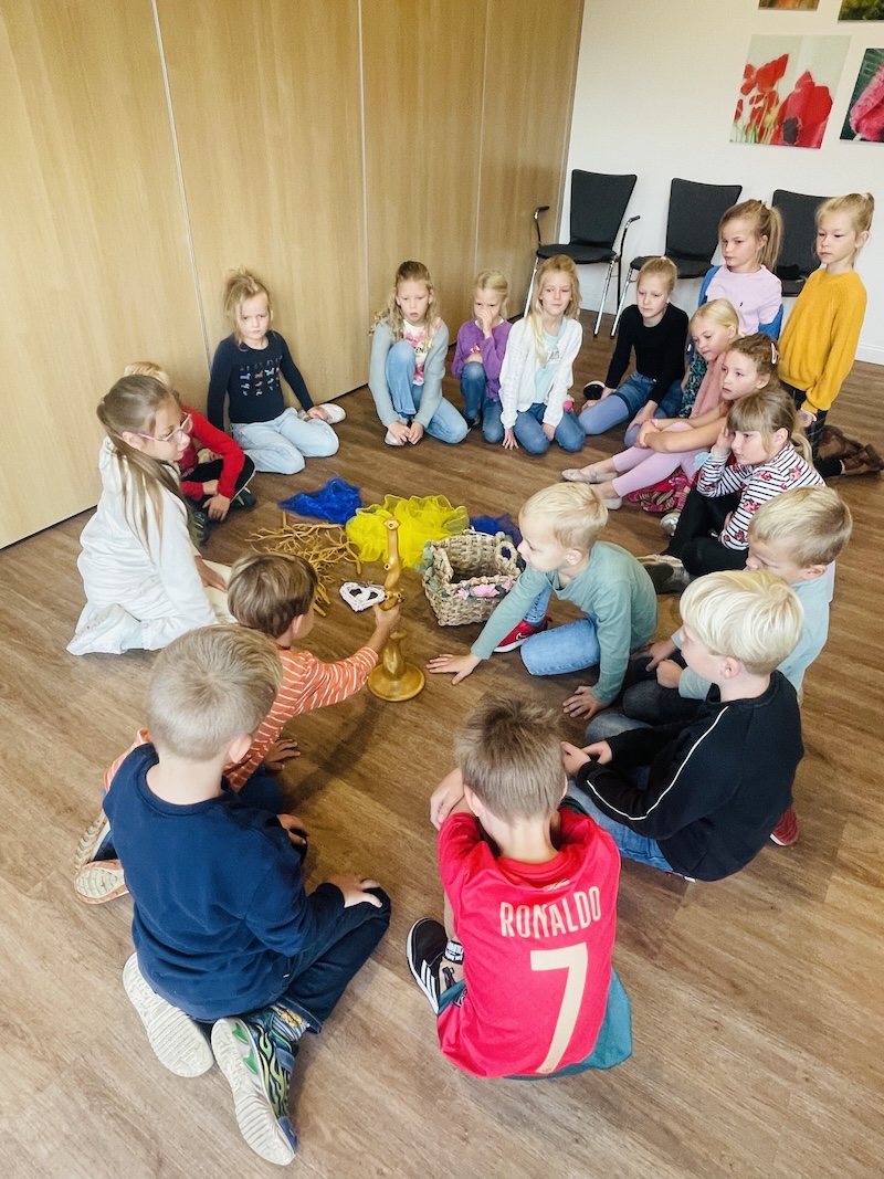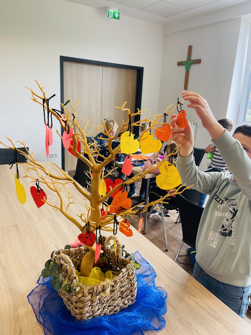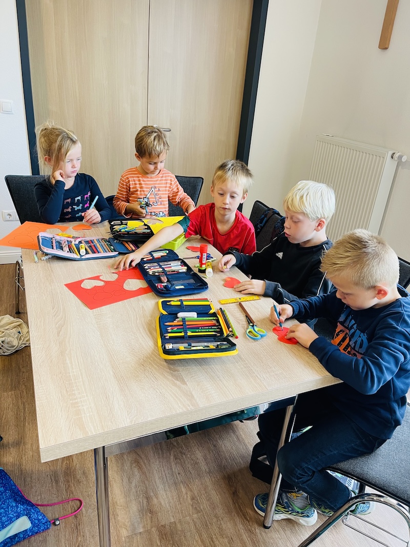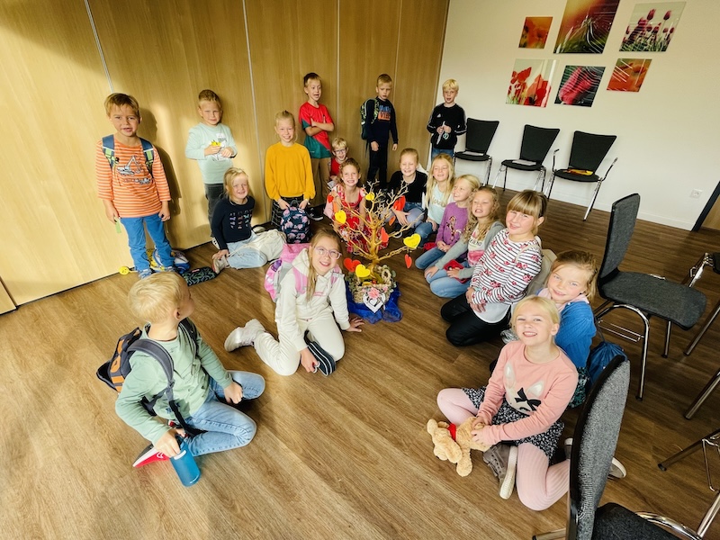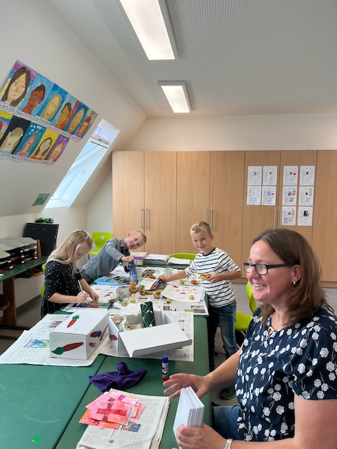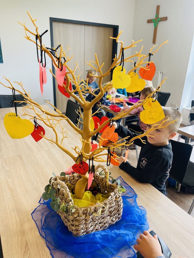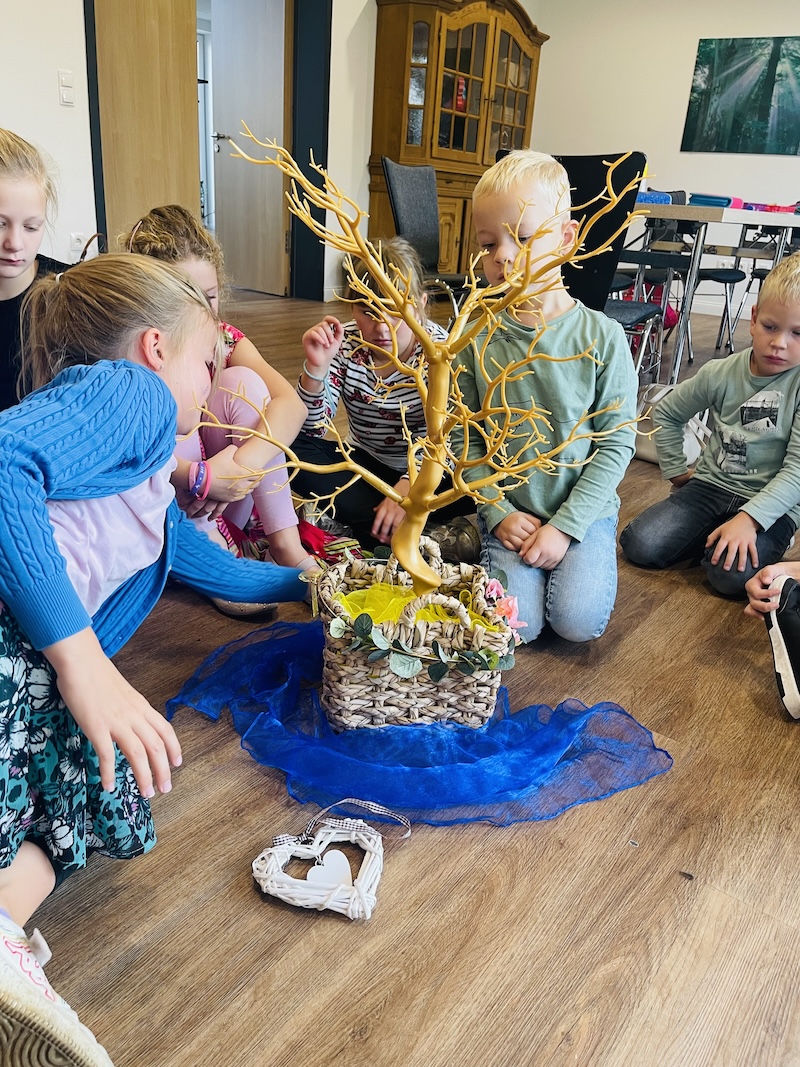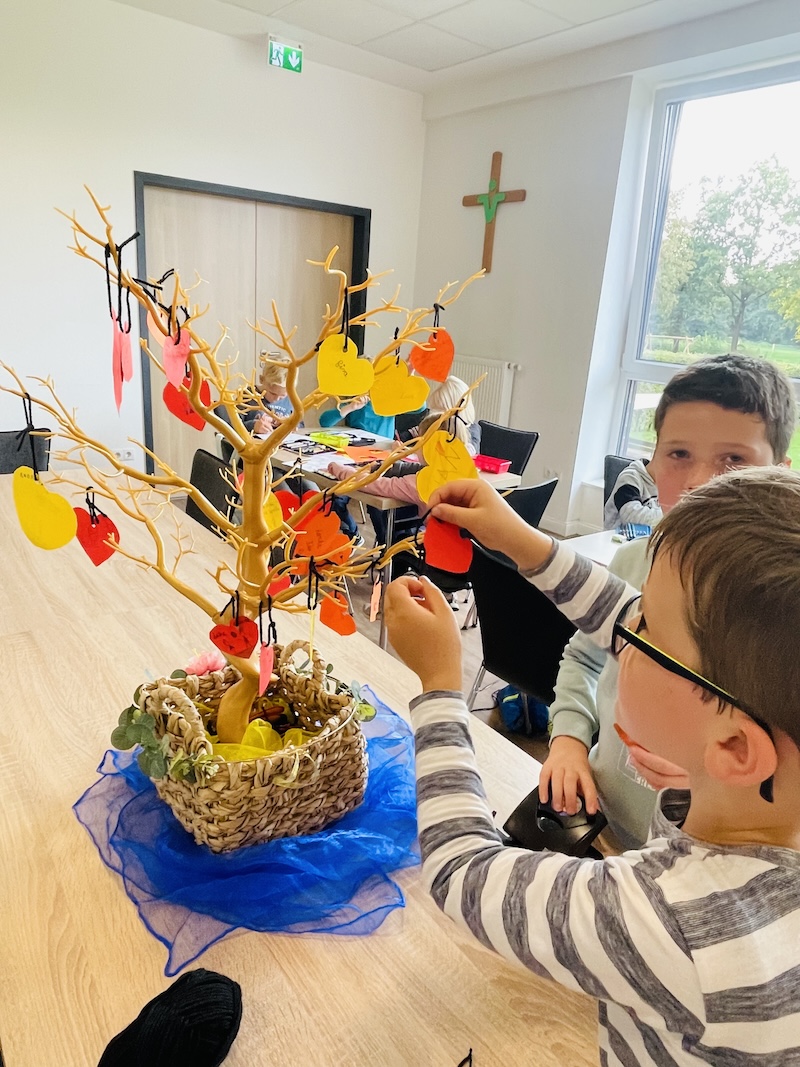 Bei Frau Wulfers durfte mit Kartoffeldruck experimentiert werden, Frau Moormann und Frau Vorholt haben mit den Kindern Tischgebetskärtchen gestaltet. Frau Albers und Frau Eck bastelten Holzmännchen und Fliegenpilzwindlichter, während Frau Kaiser und Frau Jonker sich als Waffelbäckerinnen um das leibliche Wohl kümmerten. Bei Frau Dröge konnten die Kinder beim Yoga zur Ruhe kommen und sich zum Beispiel wie eine Schildkröte fühlen. Frau Bergmann war ins Pfarrheim St. Vitus umgezogen und gestaltete mit den Kindern gemeinsam einen Dankbarkeitsbaum, der auch im Gottesdienst eine wichtige Rolle spielte. Die Klasse 4 unter der Leitung von Frau Simon kümmerte sich währenddessen um die Organisation des gesunden Frühstücks am kommenden Freitag und ging gemeinsam dafür zum Einkauf (hier einen großen Dank an Frau Sieverding und den Rewemarkt Löningen für die tolle Unterstützung!)