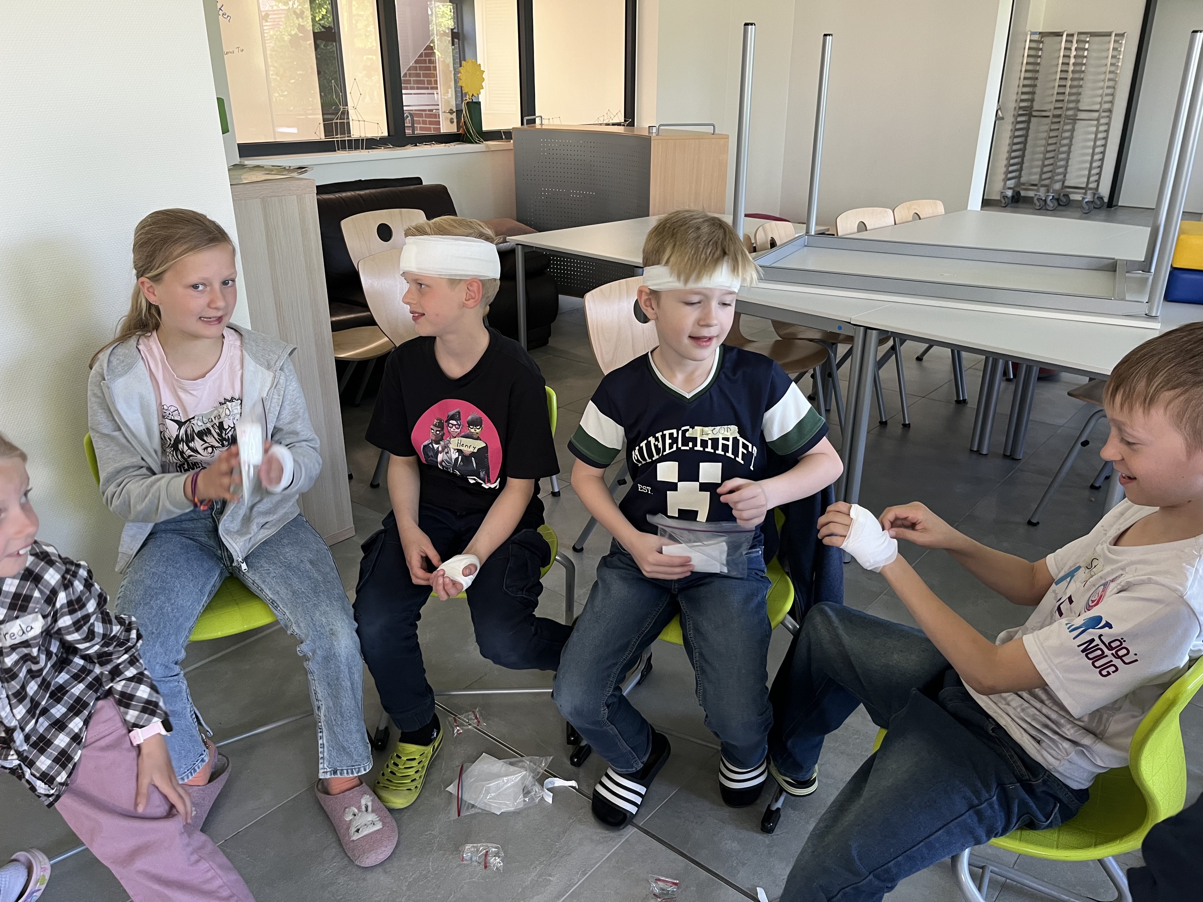 Der Kurs begann mit einer Einführung über die Bedeutung von Erste-Hilfe-Maßnahmen und der Wichtigkeit, in Notfallsituationen besonnen zu handeln. Anschließend wurde in praktischen Übungen das Anlegen von Verbänden vermittelt. Die Kinder hatten die Möglichkeit, selbst Hand anzulegen und verschiedene Verbandstechniken auszuprobieren.