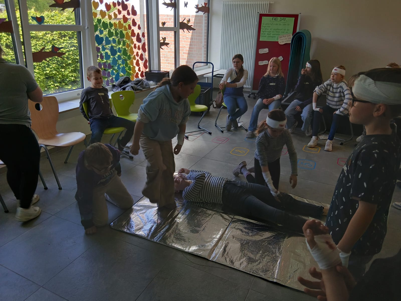 Ein weiterer Schwerpunkt lag auf den Notfallmaßnahmen, wobei die Kinder Konstellationen durchspielten, in denen sie lernen konnten, wie sie in bestimmten Notfällen reagieren sollten. Dies umfasste sowohl theoretische Grundlagen als auch praktische Einsatzszenarien, die den Kindern ein besseres Verständnis für Erste Hilfe ermöglichten.