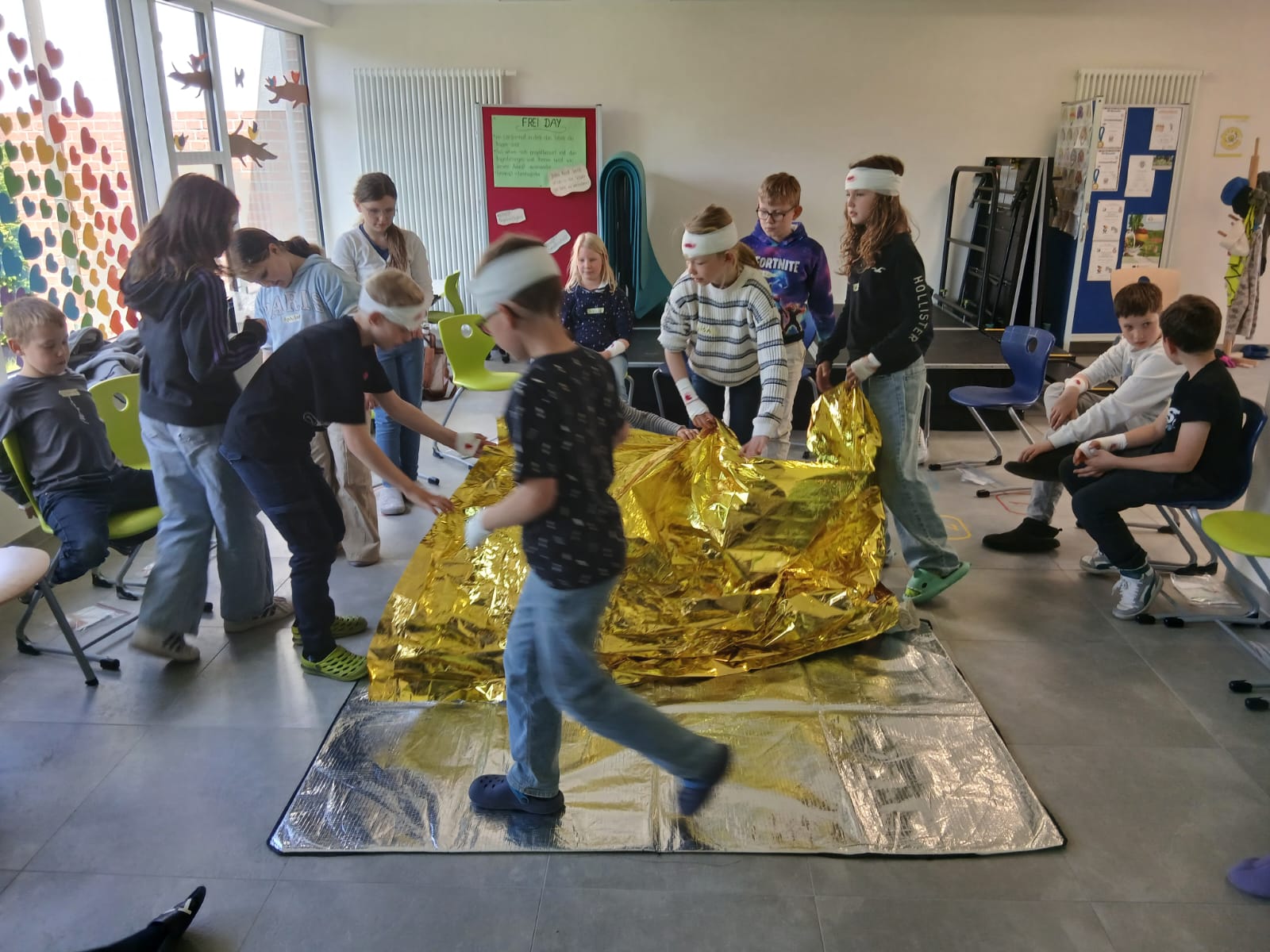 Ein weiterer Schwerpunkt lag auf den Notfallmaßnahmen, wobei die Kinder Konstellationen durchspielten, in denen sie lernen konnten, wie sie in bestimmten Notfällen reagieren sollten. Dies umfasste sowohl theoretische Grundlagen als auch praktische Einsatzszenarien, die den Kindern ein besseres Verständnis für Erste Hilfe ermöglichten.